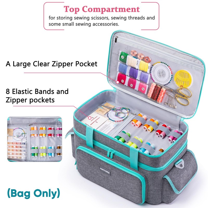 AMOIGEE Large 15" Double-Layer Sewing Storage Bag with Detachable Diviers – Large Sewing Organizer with Shoulder Strap, Elastic Loops for Sewing Supplies, Tools & Accessories