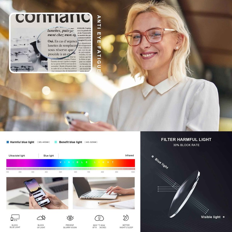 - 【Reduce Eyestrain】-Prolonged exposure to blue light will cause eye fatigue, blurred vision and headaches,By using our computer glasses, you will notice a difference in a few days.Blue Light Blocking Glasses can 100% effectively block harmful blue light coming from phones, computer monitors, gaming, and other devices. Eliminates eye strain that causes headaches, aching eyes, and blurred vision!