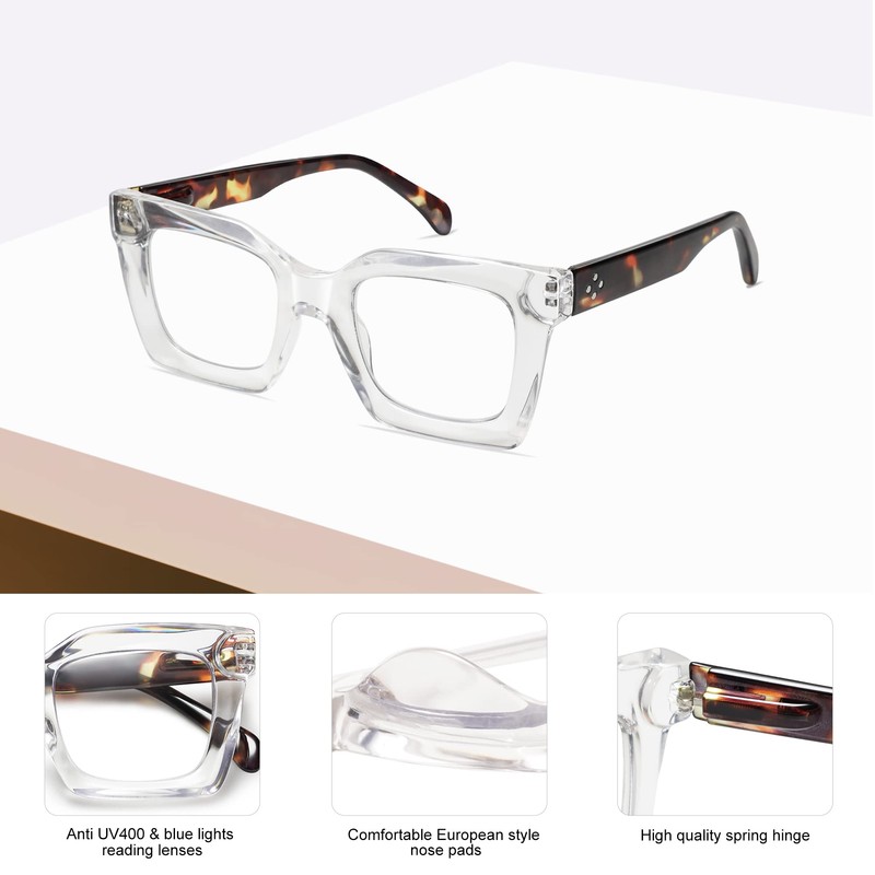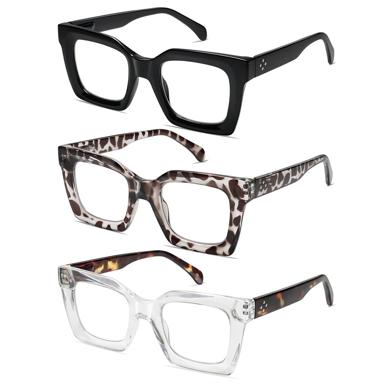 AMOMOMA 3PACK Retro Oversized Square Reading Glasses for Women Men Blue Light Computer Thick Womens Readers Spring hinge AM6015 Black/Grey Tort/Crystal 1.50 x