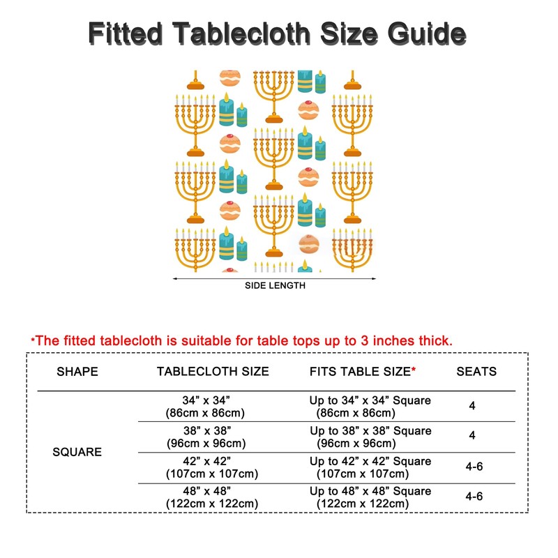 - 【SIZE】The size of the square Hanukkah holiday fitted tablecloth with elastic is 48x48 inch, fit up to 48x48 inchs 4-6 seats square or round table, suitable for table tops up to 3 inches thick. Dimensions are hand-measured and may have a 1-2 inch error.