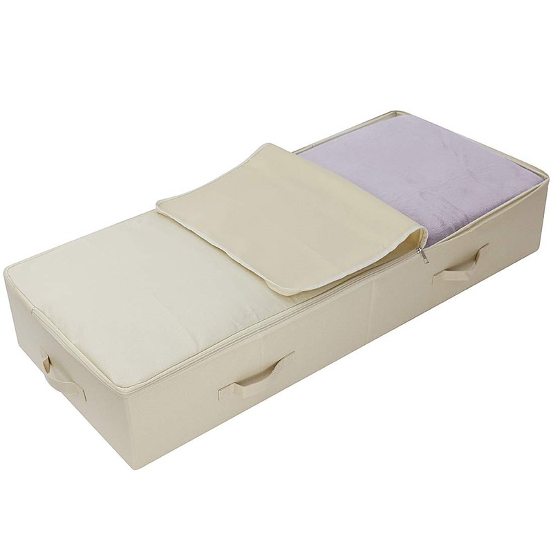 Versatile use in many places around the home. For example, under the bed/sofa, in the wardrobe for clothes, bedding, shoes, etc. Can also be used to store books, clothes, magazines, quilts, etc. User-friendly design. The lid opens on 3 sides with zipper, so that even bulky items can be entered or removed; the whole box is foldable, saving space when not in use. The plastic plate inside and at the bottom is more stable and retains the shape of the container, even if you push it inside or outside many times. Not cardboard which is not moisture proof and does not have good tear resistance. Up to 8 handles on each side are easy to push into tight places. Breathable material. 50% Polyester, 50% Linen Environmentally friendly and GSG certified without harmful elements. Dust-proof, moisture-proof, protect your items well, washable