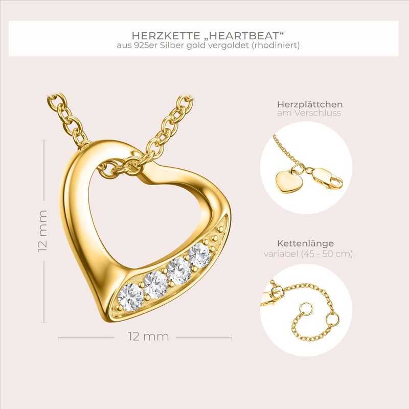 - Details: The heart necklace "Heartbeat" by Amoonic is made of 925 silver yellow gold plated (45 cm - 50 cm length) with zirconia. The gold-plated silver chain is adjustable in length by three eyelets of 45 cm - 50 cm and is guaranteed to fit. There is a small heart plate on the clasp.