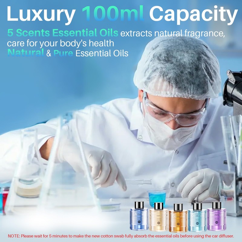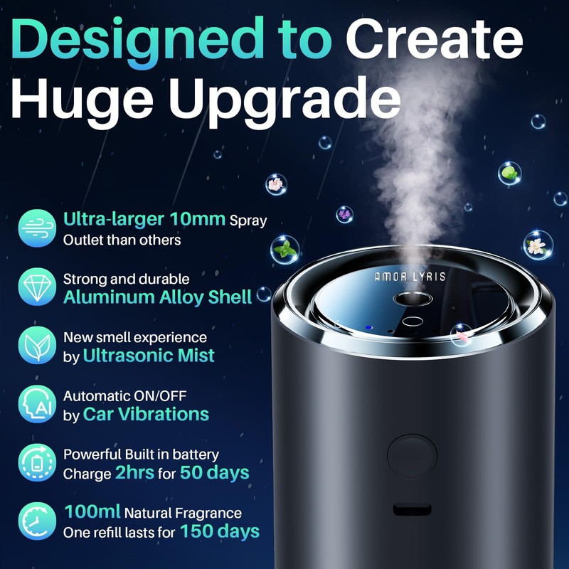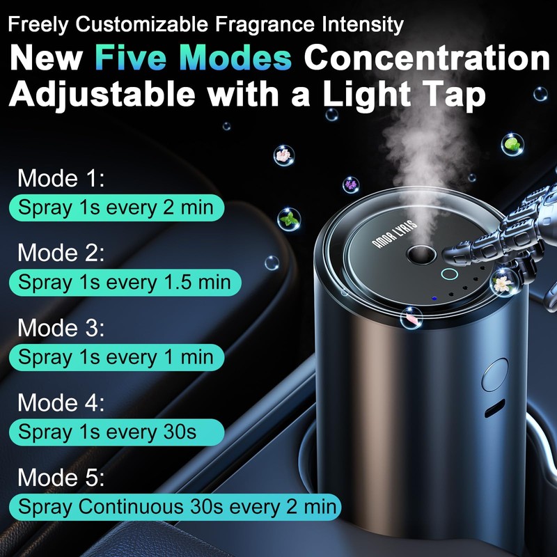 - 【Newest 5 Modes Concentration Adjustable】Amor Lyris car air freshener diffuser has 5 modes spray, freely customizable fragrance intensity, adjusting intensity according to your preference. We have specially developed mode 5 in car scents air freshener, continuously spraying for 30 seconds, making scent around.