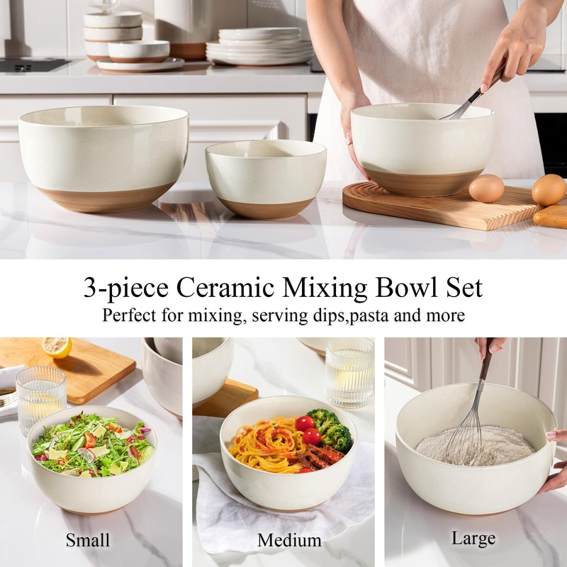 - 【3-Piece Ceramic Mixing Bowl Set】This ceramic mixing bowl set includes three sizes—42 oz, 90 oz, and 148 oz—each designed for a variety of functional uses. The 42 oz bowl is ideal for mixing small quantities of ingredients,cereal or soup. The 90 oz bowl is well-suited for handling batters, salads, salad fruit or stirring while the 148oz bowl is particularly suitable for kneading dough, recipe prep,or serving large family meals.