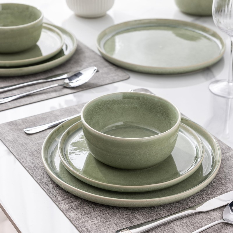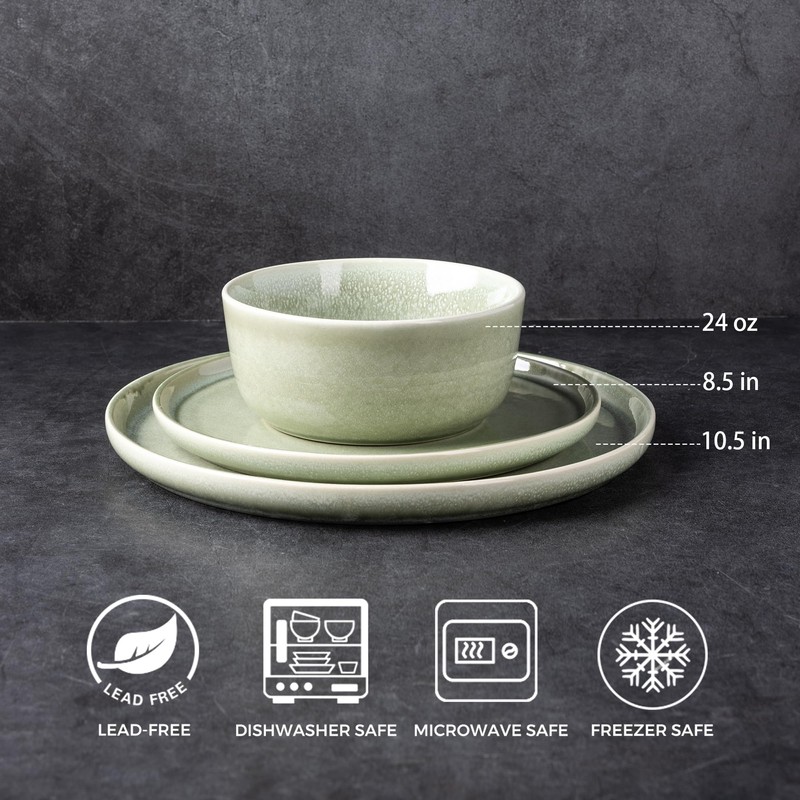 • EVERY PLATE IS UNIQUE: This dinerware set are fired with two different glazes, so the surface develops a beautiful color and makes your food looked even more delicious. The reactive glaze makes every plate unique. Since our glaze is all-natural, it tends to change color depending on the lighting. The color may be a tad different from what you see on your screen, but every item is beautiful.