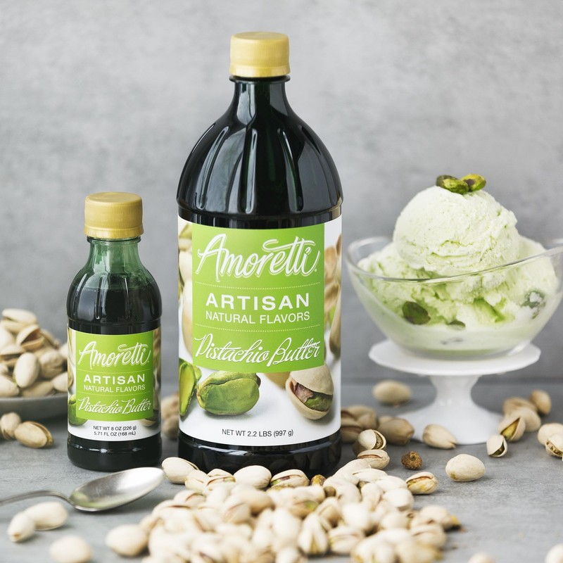 Rich, Buttery, NuttyAmoretti’s Natural Pistachio Butter Artisan Flavor Paste captures the flavor of earthy, creamy pistachios year-round. Showcasing a beautiful color, buttery sweetness, and rich nuttiness – add an irresistible spin to all your gourmet creations. Experience our perfect craftsmanship in every step from refined flavor, elegant aroma, and smooth texture. Empower your imagination – with Amoretti!Product DetailsItem #ART35Preservative-FreeMade with Real FruitNaturally FlavoredNaturally SweetenedKosher Pareve & TTB ApprovedNon-GEO/GMO Project VerifiedShelf-Stable*Gluten Free**Purée Alternative***No Artificial IngredientsVeganProudly Handcrafted in Southern CaliforniaItem #ART35Preservative-FreeMade with Real FruitNaturally FlavoredNaturally SweetenedKosher Pareve & TTB ApprovedNon-GEO/GMO Project VerifiedShelf-Stable*Gluten Free**Purée Alternative***No Artificial IngredientsVeganProudly Handcrafted in Southern California*All Amoretti Artisan Natural Flavor Pastes remain shelf-stable even after opening. For optimal color retention of reds, please refrigerate. Mix well before use.**Produced in a facility that uses milk, tree nuts, peanuts, soy, eggs & wheat. Contact info@amoretti.com for more information.***2 oz Artisan is equivalent to 24 oz Fruit PuréeApplicationsFlavor high fat content baked goods, cheesecakes, buttercreams, cakes, whipped creams, cupcakes, frostings, and more! Enhance ice creams, gelatos, sorbets, frozen yogurts, mousses and more! Elevate craft beers, liqueurs, wines, and more!Use LevelsDue to the concentration level of Amoretti Artisan Natural Flavor Pastes, it is highly advisable to follow the use level guidelines:FOOD USE LEVEL: 3-5% = 30-50:1000 DRINK USE LEVEL: 0.5-1% = 5-10:1000 (about 7-14oz by weight per 10 gallons) Find out more about use levels and how to calculate them here: Usage Tools & Guides