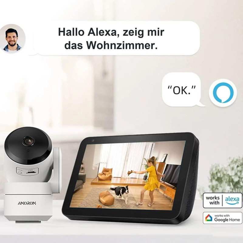 • Voice control and 2-way audio: connect your Amorom surveillance camera indoors to Alexa Echo for seamless voice control. Simply use a voice command to access your live camera feed. With the built-in microphone and speaker of the indoor camera, you can easily communicate with your family, children or pets via the Amorom app from anywhere.