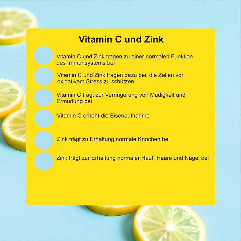 - VITAMINBOMBE I mit 160 mg Vitamin C und 14 mg Zink. Eine wahre Vitamin -C-Bombe. Dein Immunsystem freut sich darber. Ganz besonders in der Erk?ltungszeit ist ein starkes Immunsystem sehr wichtig. Vitamin C und Zink tragen zu einer normalen Funktion des Immunsystems bei. 100 Prozent VEGAN