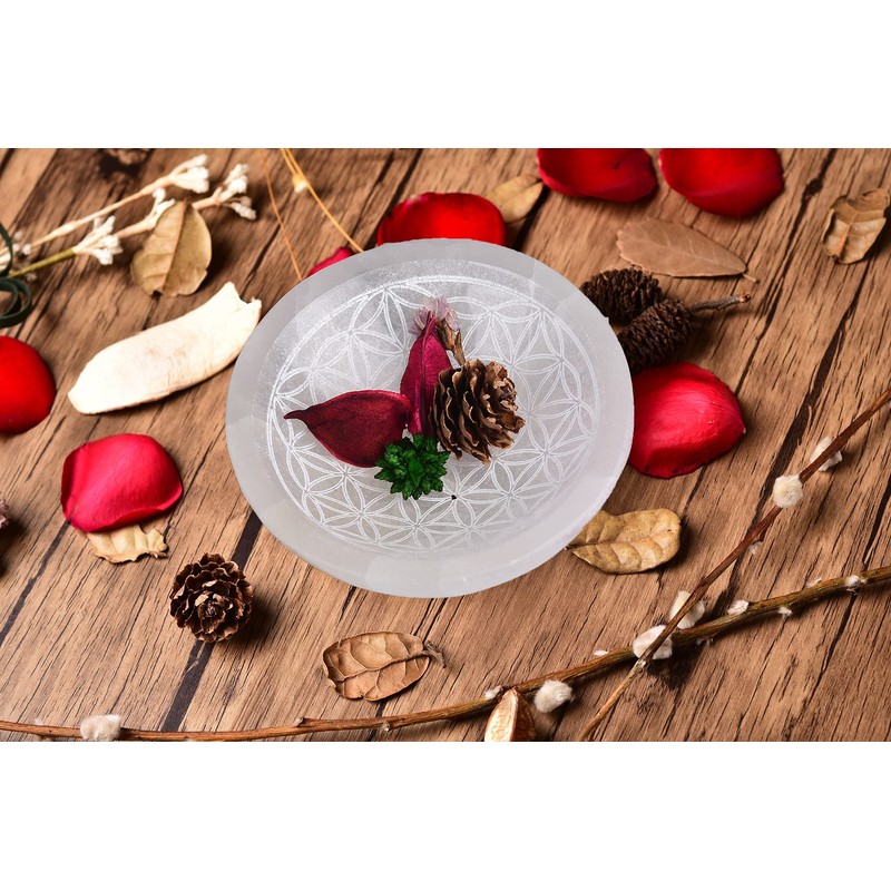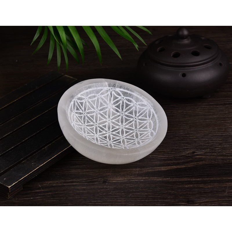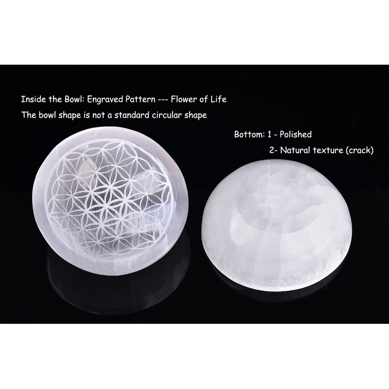 - Moroccan Selenite Bowl: Hand-carved into round, and Engraving pattern flower of life, Size: Approximately 4" in diameter, 1" in Thickness, weight 0.5~0.6 lbs