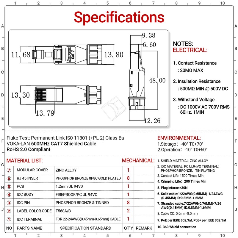- Package: Zinc-Alloy CAT7 Tool-Free Ethernet Field Termination Modular Plug -12 Pack