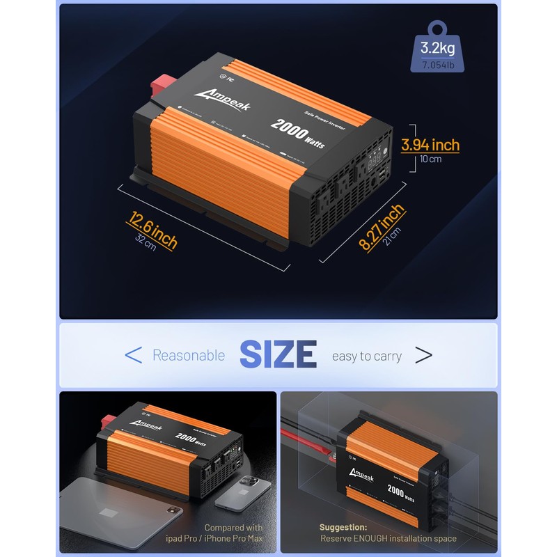 Ampeak 2000W Power Inverter Conversion Efficiency 89.37% Inverter 12V to 110V 3AC Outlets Dual 5V/3.1A USB Ports Modified Sine Power Inverters for Vehicles