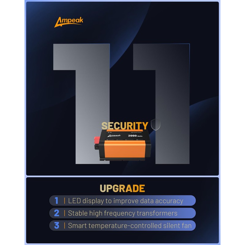 - 11 Safety Protections: Ampeak prioritizes safety with 11 built-in protections, ensuring your power inverter and devices operate safely and reliablymore than double the protections of most other inverters.