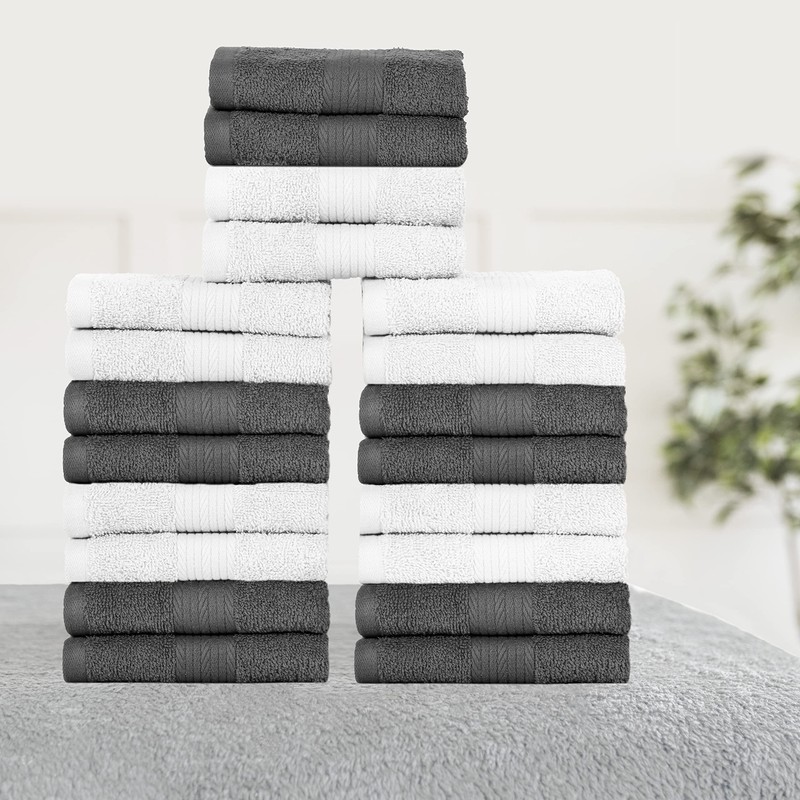 Ample Decor Wash Cloths Pack of 20 100% Cotton 600 GSM Oeko Tex Certified Face Towels, Quick Drying Solid Construction Absorbent Machine Washable - White - Grey - 12 X 12 Inch