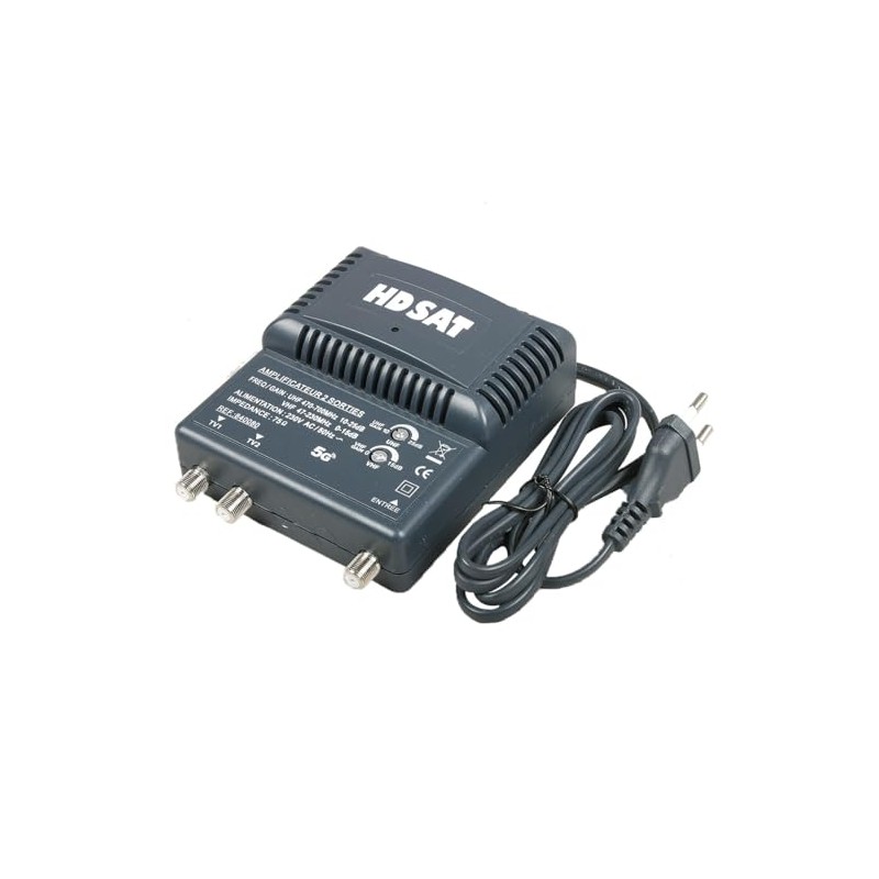 - Dieser Innenverstärker ist ideal, um einen Signalmangel in Ihrer Wohnung zu lindern. Er ist mit Anschlüssen vom Typ "F" ausgestattet. Es hat 1 Eingang und 2 Ausgänge. Es wird direkt mit 220 V versorgt.