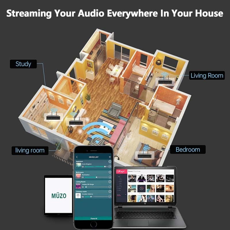 • Multi-Room & Multi-Listener Synchronization – Create a seamless whole-home audio system. With support for multi-room sync (Party Mode), play the same song across different zones or different music in each room—all controlled from one smartphone. Multiple users can also connect via WiFi simultaneously.