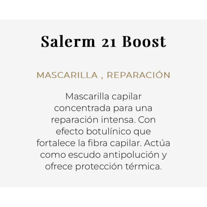 Salerm 21 Boost es un tratamiento capilar intensivo diseñado para revitalizar y fortalecer el cabello desde la raíz hasta las puntas. Formulado con proteínas de seda y provitamina B5, ayuda a reparar la fibra capilar, aportando fuerza, hidratación y brillo natural. Ideal para cabellos débiles, dañados o castigados por procesos químicos o el calor, este producto mejora la manejabilidad y controla el frizz, dejando el cabello más saludable y con un aspecto renovado.