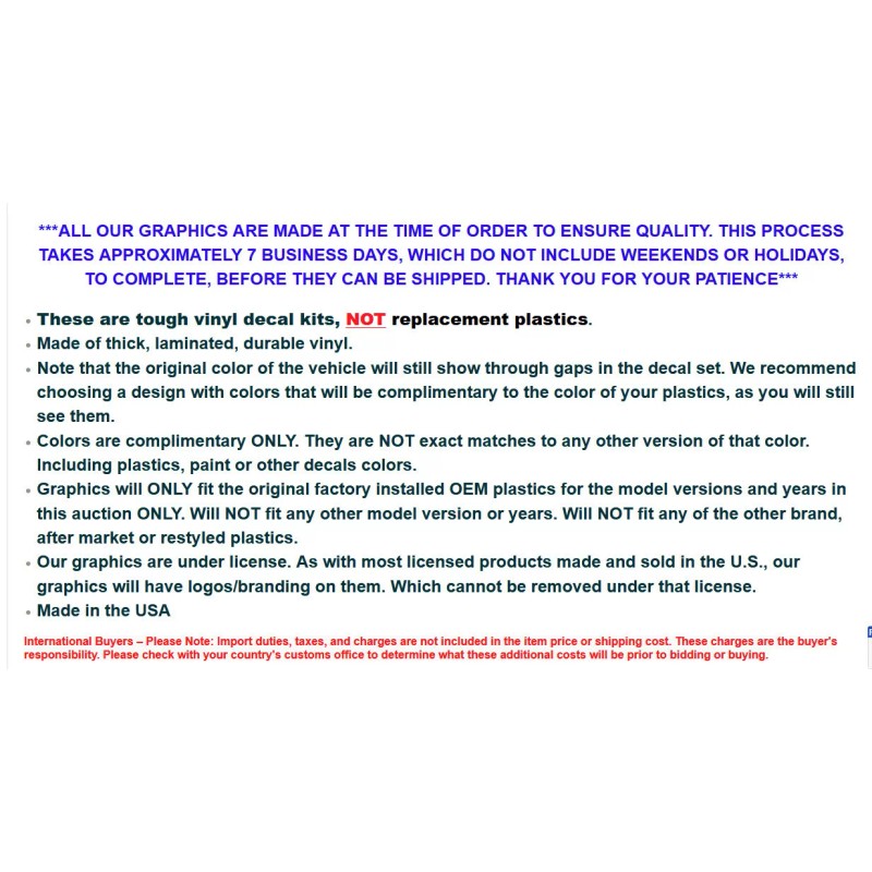 - Graphics will ONLY fit the original factory installed OEM plastics for the model versions and years in this auction ONLY. Will NOT fit any other model version or years. Will NOT fit any of the other brand, after market or restyled plastics.