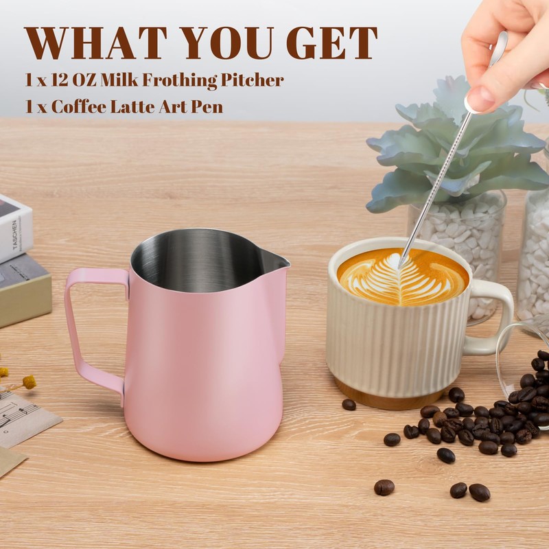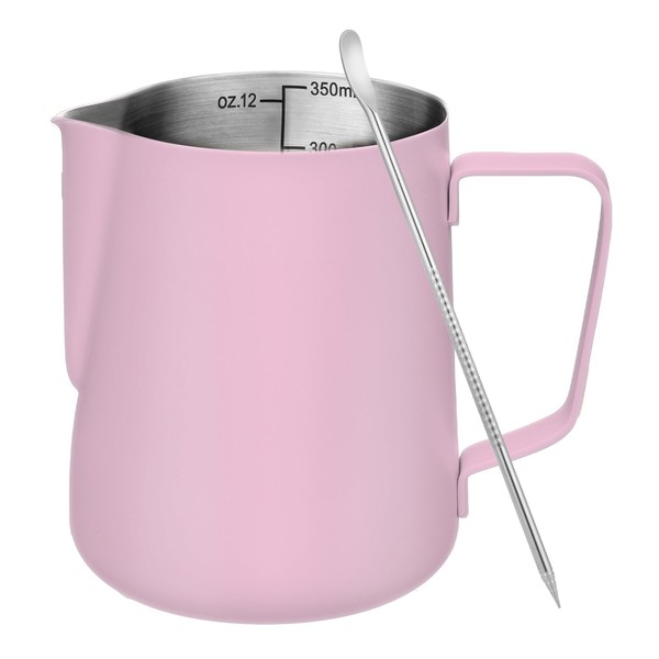 Amrules Milk Frothing Pitcher, 12 oz Milk Frother Cup with Clear Scale, 304 Stainless Steel Cappuccino Espresso Machine Accessories for Barista Coffee Bar with Latte Art Pen, Pink