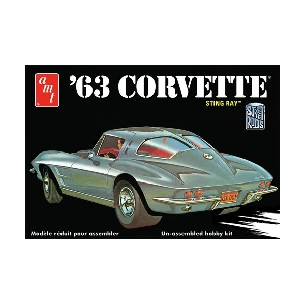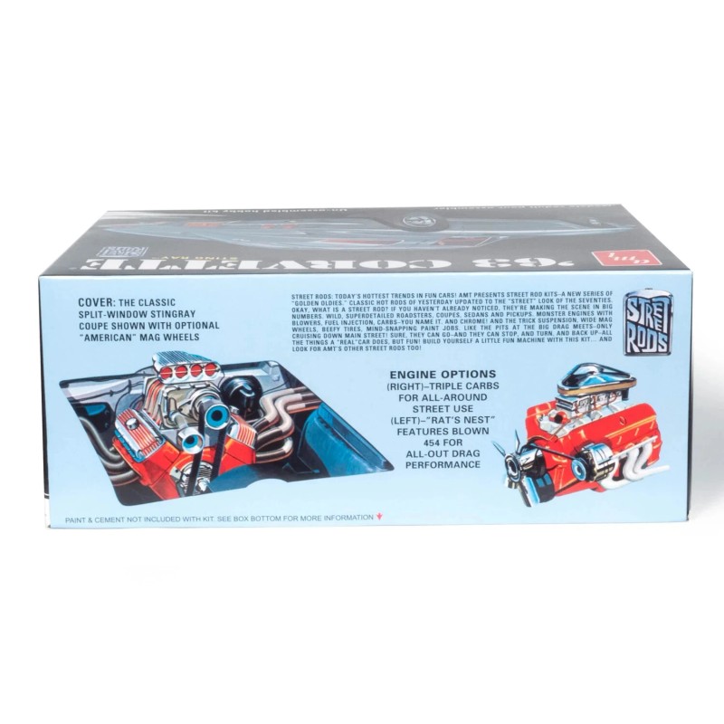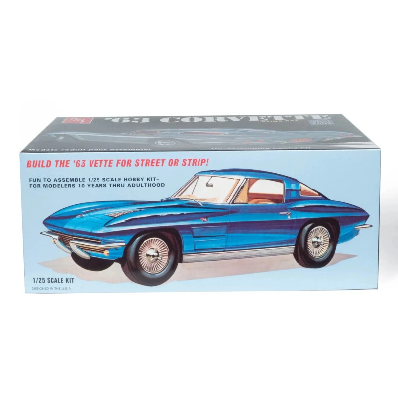 AMT presents the 1963 Chevy Corvette Sting Ray as a Retro Deluxe™ reissue, recreating the 1970’s Street Rods Series release. This 3-in-1 kit features parts to build factory stock, street custom, or drag gasser versions. With pre-lettered drag slicks and an all-new retro-styled full-color decal sheet, the kit is improved greatly over past releases and the vintage box art is sure to please!