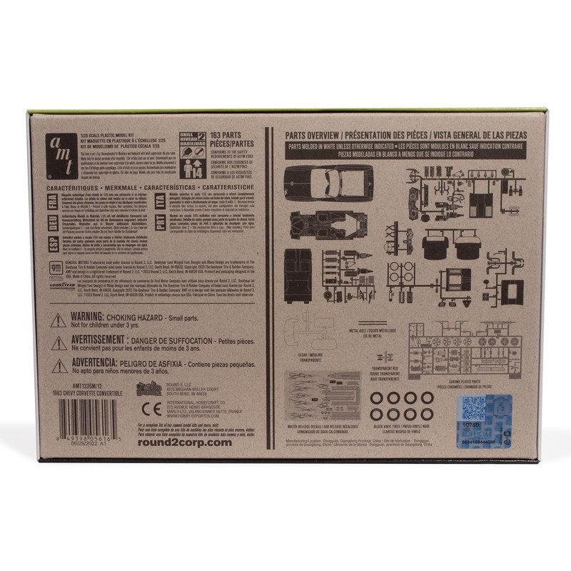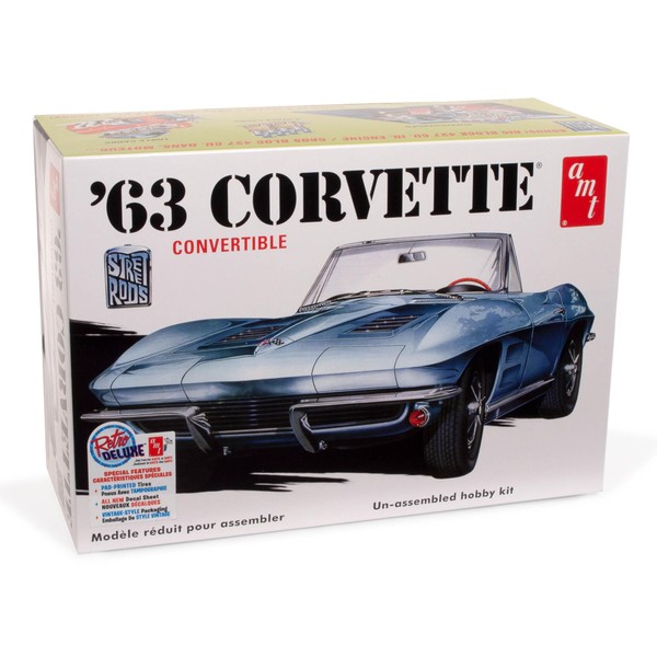 • 1963 Chevy Corvette ConvertibleCLASSIC 3-IN-1 CONVERTIBLE: AMT's 1/25 scale 1963 Chevy Corvette Convertible is great project for any experienced modeler who is a fan of classic Corvettes. This 3 in 1 kit can be built as convertible, Street Rod or custom. Add it to your collection today!