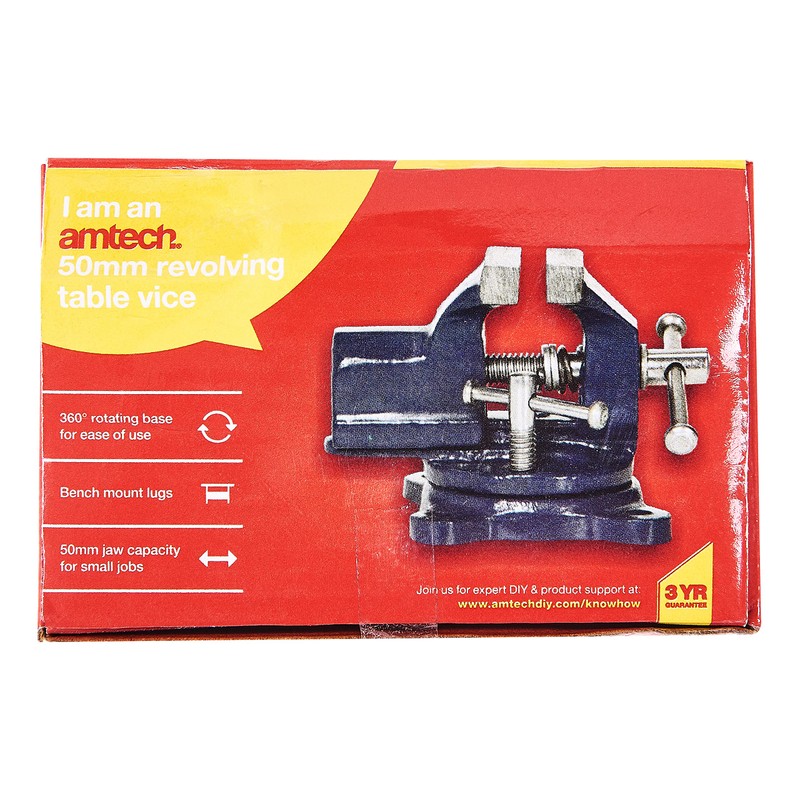 • DURABLE: This 50mm (2") revolving table vice has a cast iron body and hardened jaws with a steel spindle and tommy bar for durability. It is ideal for model making and small DIY jobs