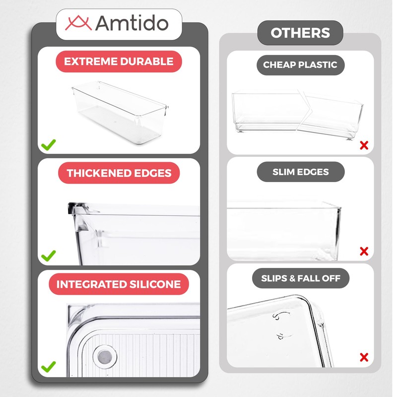 Amtido Drawer Organiser Tray Set - Clear Plastic Containers for Kitchen Utensils, Cosmetics, Food, and Stationery - Use in Drawers, Cupboards, Fridge, and Countertops (4 Pack - 10.2 x 10.2 x 8.3)