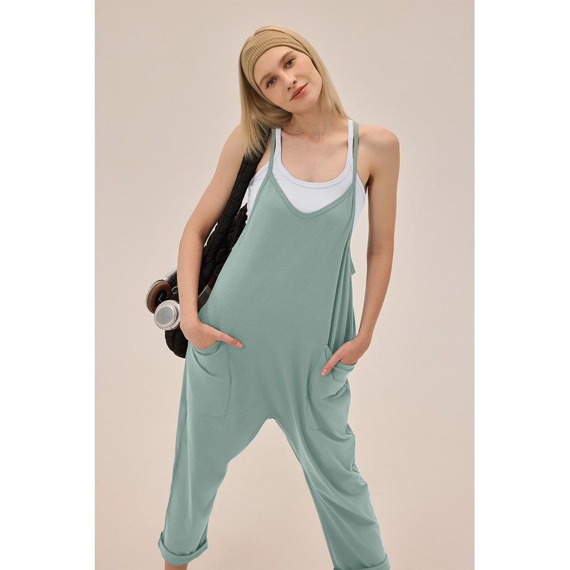 - Stylish Design: Features a deep V-neck, wide-leg long harem pants, adjustable spaghetti straps, and large side pockets, creating a flattering loose fit
