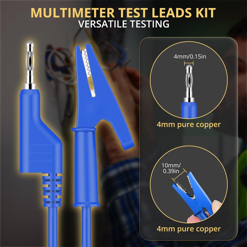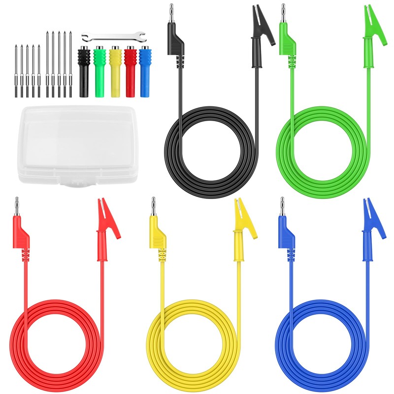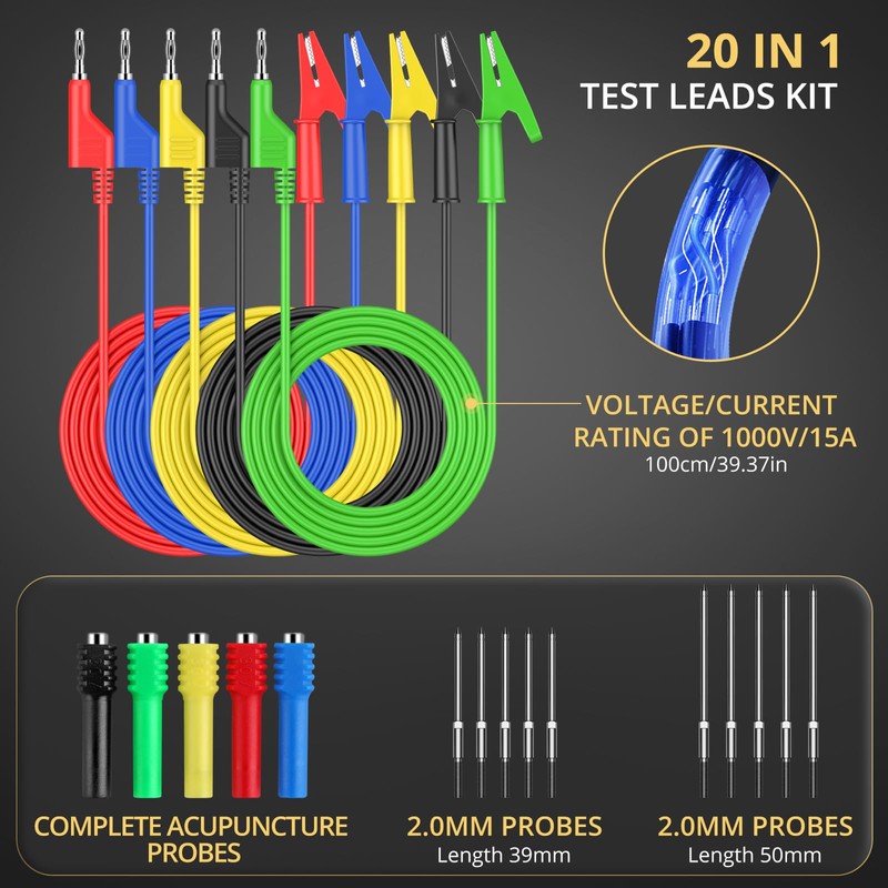 • 【Banana Plug to Alligator Clips Set】 With a cable length of 39.37", 1000V/15A: Stackable 4mm banana plugs on one end and solid copper alligator clip on the other end (max opening: 10mm), 5 complete acupuncture probes and 10 probes included