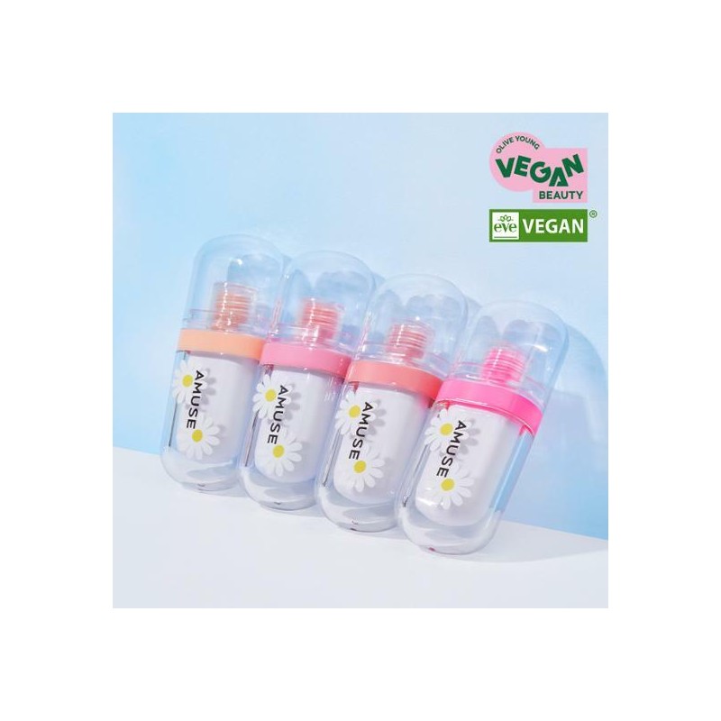 Olive Young’s # 1 lip tint ! 12-hour lasting Jel-Fit Tint that provides jelly-like dewy formula for clear vivid lip makeup ! By revising its previous dewy tint formula, AMUSE presents this new super-fit tint with 12-hour lasting color, gloss, and hydration. Its triple gloss system maintains jelly-like dewy juicy lip makeup for long hours. Its firm and bouncy jelly texture leaves lips with super-fit coating finish. Tested for 12-hour lasting color, gloss, and hydration. Its users provided positive comments on great pigmentation, no dryness, long-lasting formula, non-sticky & firm texture, super-fit gloss, cute and unique package. Great choice for a watery, vivid, non-drying tint makeup with long-lasting hydration and super-fit plump-looking gloss. It even comes in a cute and handy package for your small makeup pouch ! French EVE-Vegan certified. Its jelly-like tint formula creates a coating effect for long-resistant vivid color, high gloss and moisture by reducing smudging and fading. 8 shades of Jel-Fit Tint help create a range of plump-looking dewy lip makeup. Long-lasting juicy jelly on your lips ! Perfect dewy gloss at any angle, with no hassle of retouch ! This new Jel-Tint in AMUSE’s unique cute & handy package design helps create a dynamic peach-colored vibe for your lip makeup routine! French EVE-Vegan certified. AMUSE vegan lip tint supports values for a sustainable environment. Allergen-free peach fragrance is used. Formulated without Hwahae-listed potentially allergenic ingredients. Printed with FSC-certified & Soy-based ink.