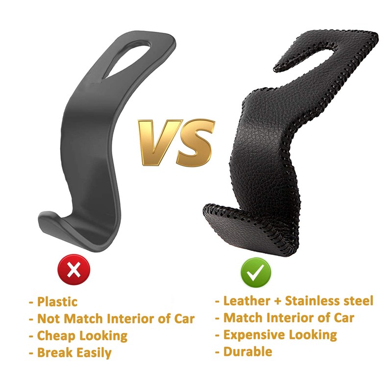 - HIGH QUALITY - These black car headrest hooks made of metal and covered in leather, which make the hook sturdy and match your car seats perfectly
