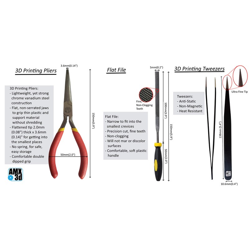 - THE ESSENTIAL TOOLS FOR 3D PRINTING: Our Pro Grade Tool kit has everything needed to remove, clean & finish 3D printed models in one convenient toolkit. Selected for function and quality, these tools were selected, designed, assembled and are supported by AMX3d in Lisle, Illinois. These high quality, Professional Grade tools are the essential addition to any 3D printing system.