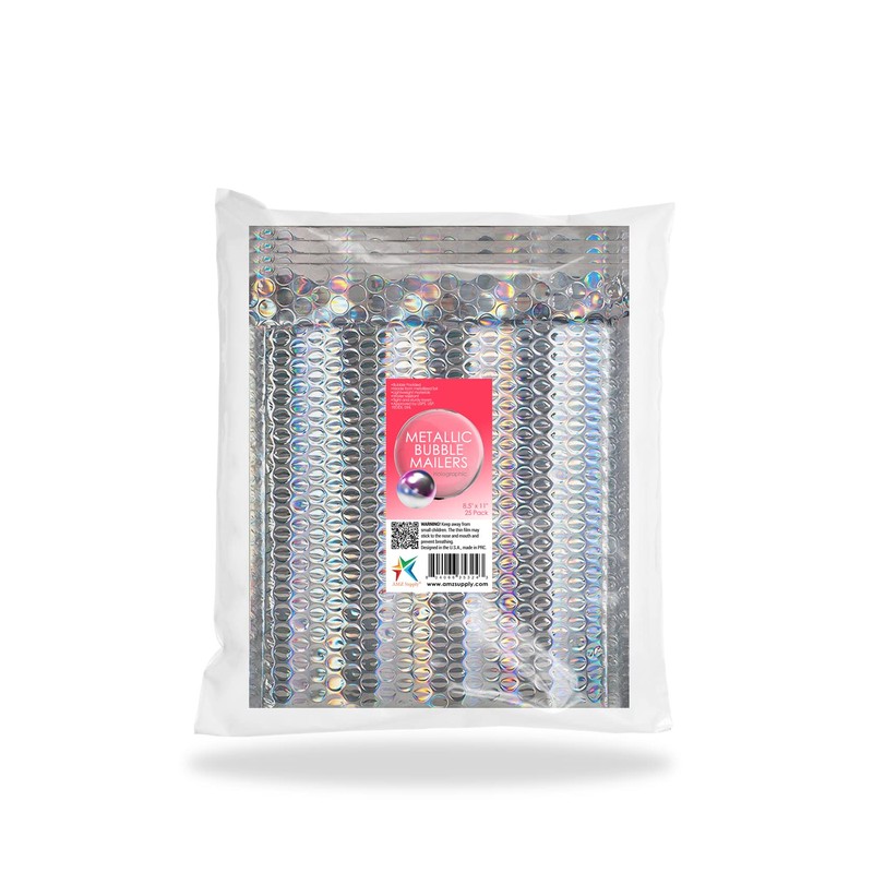 - 25 PACK OF HOLOGRAPHIC MAILERS 8.5 x 11: our mailing envelopes are made of metalized foil with a polyethylene bubble lining. Thanks to these materials, our holographic shipping bags are waterproof and tamperproof. Also, our holo bubble package is durable and sturdy.