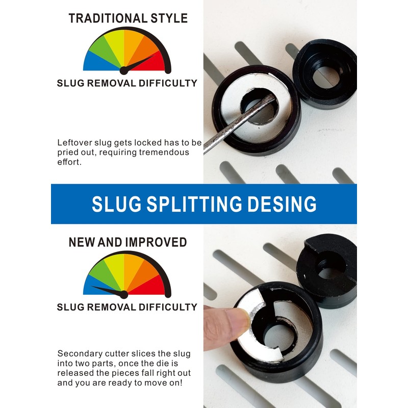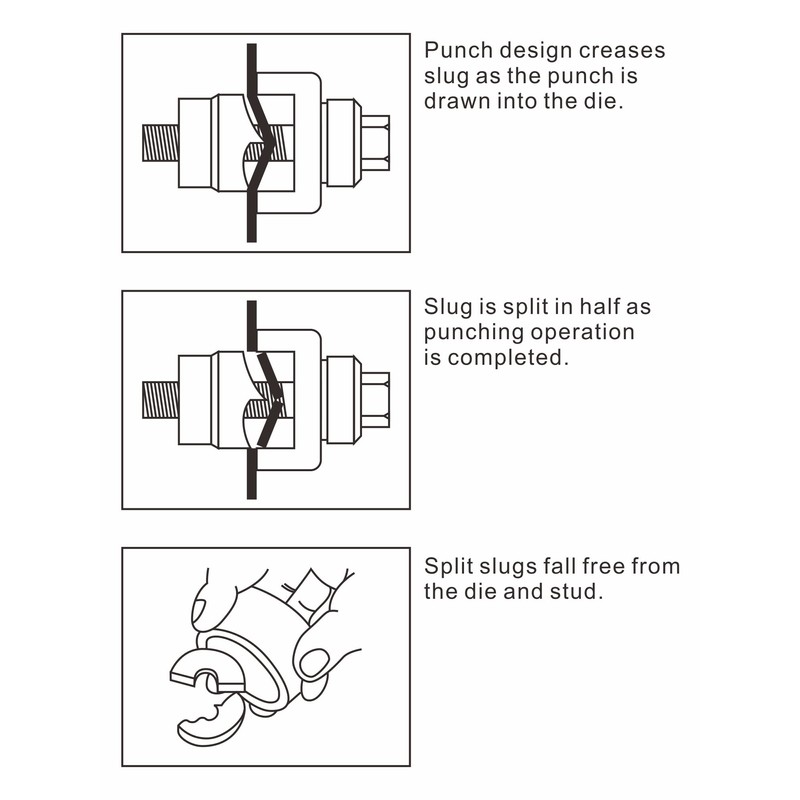 - Slug splitting design on punches allows for easier slug removal – the smooth operation leaves the round hole with clean edges and a uniform size. Manual punch works for use in tight areas.