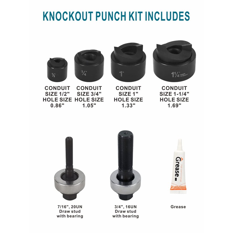 - Economic Knockout Punch Driver Set, complete conduit punch set include 4 dies, 4 hole punches, 2 bearing driving bolts