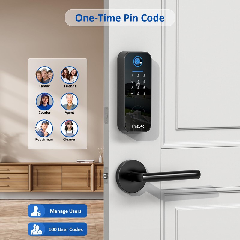 • 【5-in-1 Keyless Entry Door Lock】Amzloc smart deadbolt door lock supports Fingerprint recognition(up to 100 fingerprints),one-tap Bluetooth app control within range,keypad passcodes,Card,or 2 mechanical Key.Our advanced fingerprint door lock means no more worrying about enterring home when you forget your lock