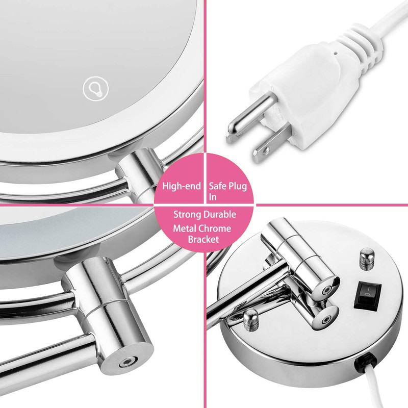 - 【MAKEUP MIRROR WITH LIGHTS& POWERED SUPPLY BY AC PLUG】①This wall mounted makeup mirror with lights and magnification is built-in LED Lights. No Visible flicker. The light source is stable. The color temp is 6,000K, like natural daylight. The good choice of bathroom mirrors for vanity, you can make up in the dark or poorly light areas. ②This lighted makeup mirror wall mounted plug in, it can be powered by connection with the AC electricity directly.
