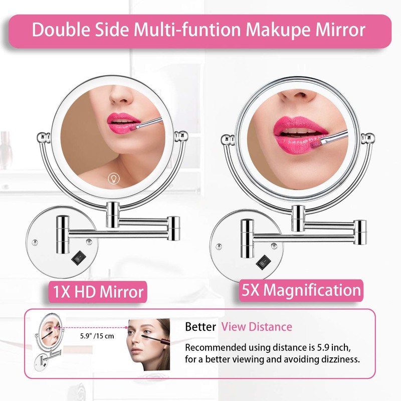 - 【DOUBLE SIDED MAKEUP MIRROR WITH MAGNIFICATION】①Amznevo led wall makeup mirror is designed with double-sided, both sides can achieve more than 10 Million Pixels HD Effect②5x wall mounted magnifying mirror can guarantee No Pixels Loss and zoom in without distortion and dizzy feeling.③This mirror can provide the most suitable makeup experience and can zoom on your facial features,allowing you to see your face clearly. Ideal wearing contact lenses, eyebrow trimming, makeup, shaving mirror.