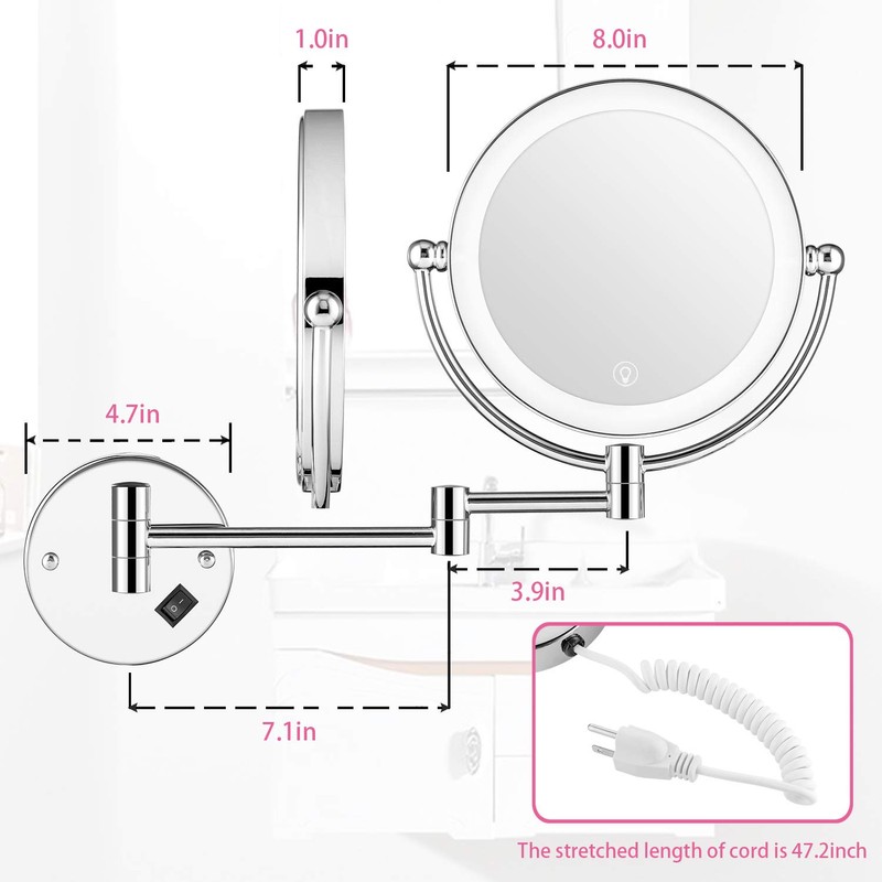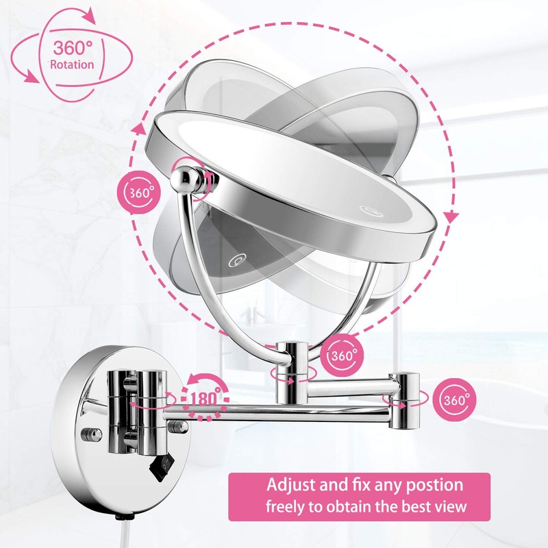 - 【360° SWIVEL MIRROR&FOLDABLE Bracket DESIGN】①The wall makeup mirror face can be rotated 360 degrees. You can adjust the mirror to any angle and position you need.②The mirror is designed with an extension arm, which can be smoothly extended and folded, which is very suitable for tightly placed on the dressing table. ③The Mirror frame,column,and base are made of metal, which is very durable.The shaft has passed the fatigue test of 10,000 times, which proves its durability and non-loose properties.