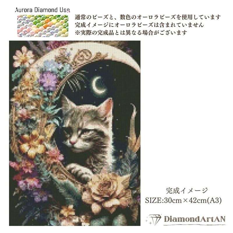 AN-diaart AMAB-19 Aurora Beads Diamond Art Kit, A3, Square Beads, Beginner, Moon, Illusion, Cat