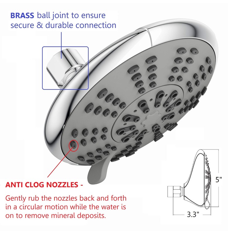 - MATCHING 5 MULTI-FUNCTION HIGH PRESSURE DRENCHING SHOWER HEADS: Premium large 5" Handheld shower head with ergonomic grip handle and click lever dial | 5" Fixed shower head with angle-adjustable BRASS ball joint for secure and durable connection | 5 settings include Rain / Massage / Massage and Rain Mix / Oxygenated Bubble /Oxygenated Bubble and Rain Mix.