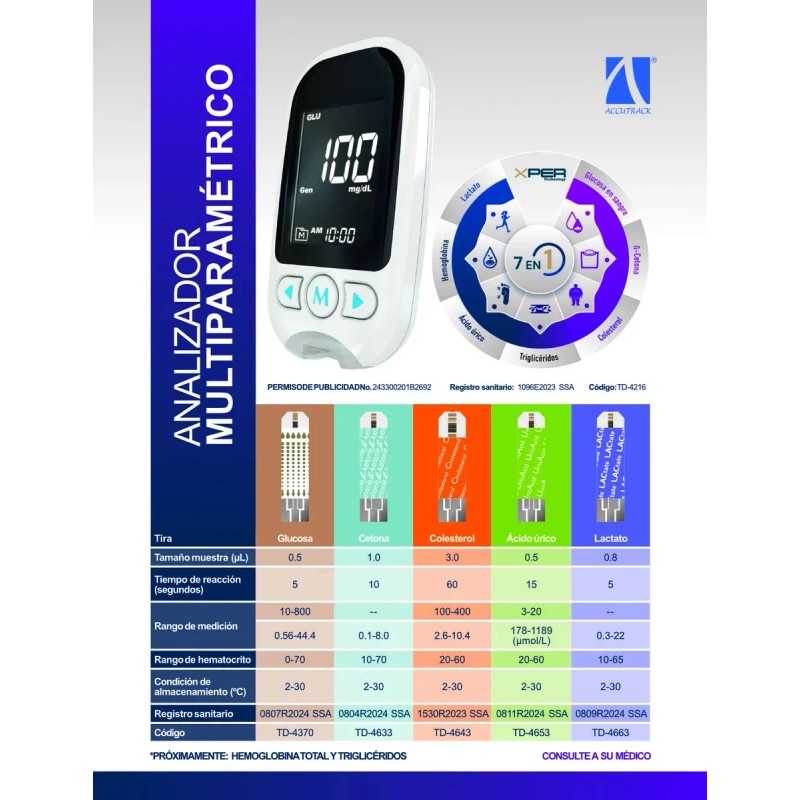 • El equipo acepta las pruebas de glucosa, colesterol, triglicéridos, ácido úrico, lactato, cetona y hemoglobina total.