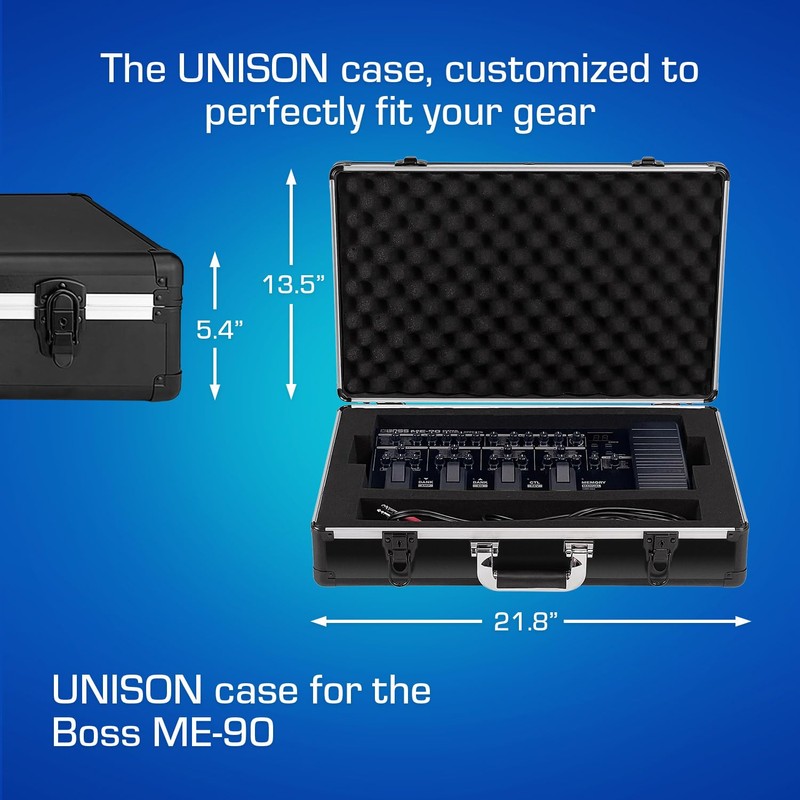 The perfect case for your Boss ME-90: an ideal travel solution for guitarists on the move. Expertly designed for a precise fit, this compact hard case is crafted with ultra-lightweight aluminum materials for the ultimate in mobility. We've re-invented cases for a new generation of modern musicians. Unlike the typical old-school road cases, the UNISON case comes equipped with a comfortable padded handle, and is only 1/3 the weight of other available hard cases. Inside the case, your ME-90 is surrounded with a dense foam insert that is molded to the exact dimensions of the gear, ensuring it will remain safe and secure during travel.