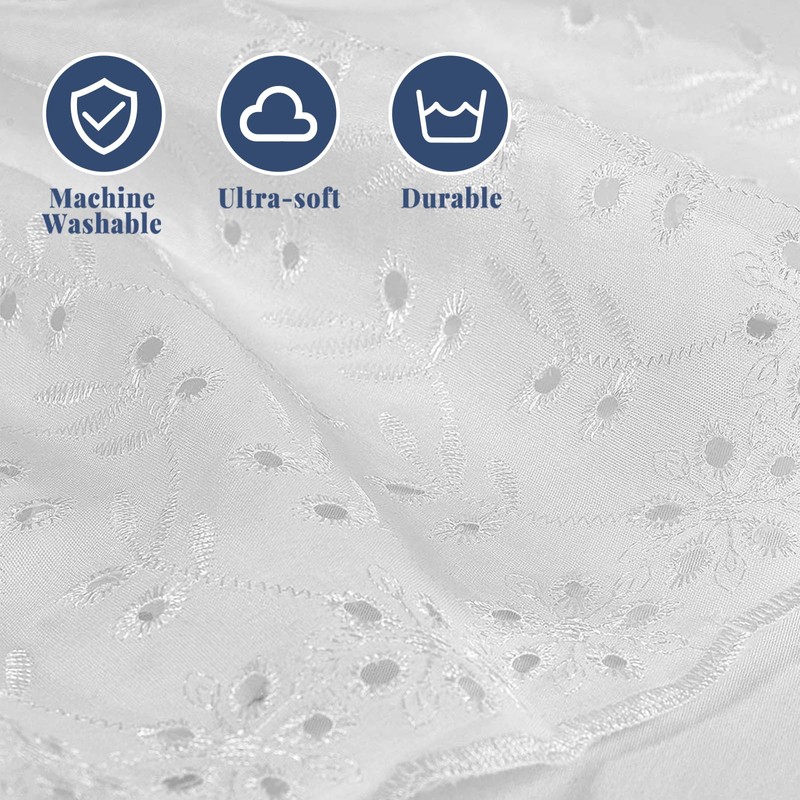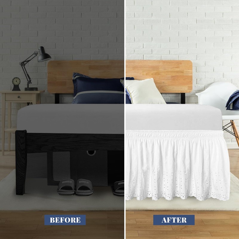• Hidden Storage: Our bed skirt conceals box springs, bed frames, and legs that you'd rather not be visible. The elegant eyelet embroidered design allows you to tuck things under your bed and keep them out of sight.