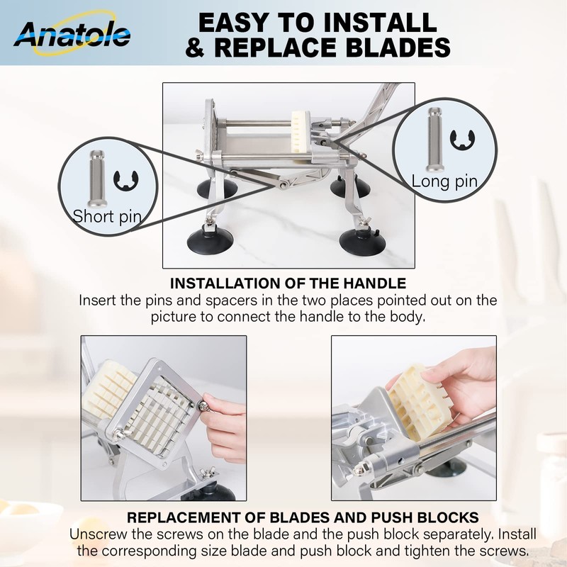 Anatole French Fry Cutter includes 1/2'', 3/8'', 1/4'', 8-Wedge blades, four suction cups, two cleaning brushes, and an instruction manual. We provide one year warranty, if there is any problem with the product, please feel free to contact us.