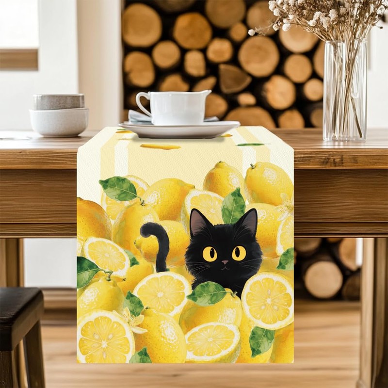 - High Quality Material: Table runner with lemon and black cat pattern is made of high quality polyester faux linen fabric. It is soft and light weight, can stay wrinkle free and stain resistant