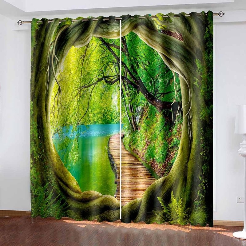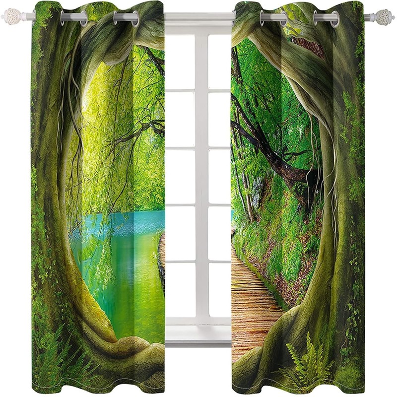 ANAZOZ Curtain Panel Grommet,2 x 42W x 54H IN,2 Piece Blackout Drapes Dining Room Lake and Trees Landscapes Curtains Green Blackout