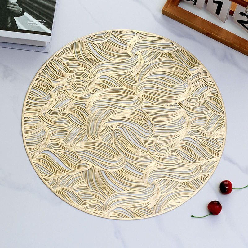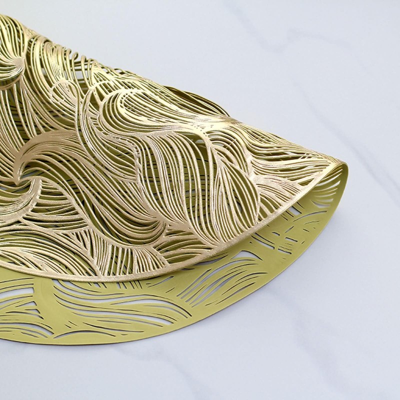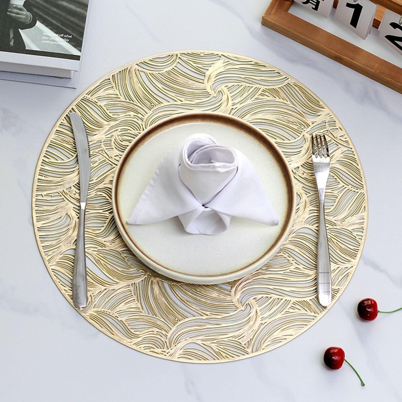 ANAZOZ Round Placemats Set of 6,Placemat PVC 14.97 IN,Round with Leaf Pattern Gold Placemat Small