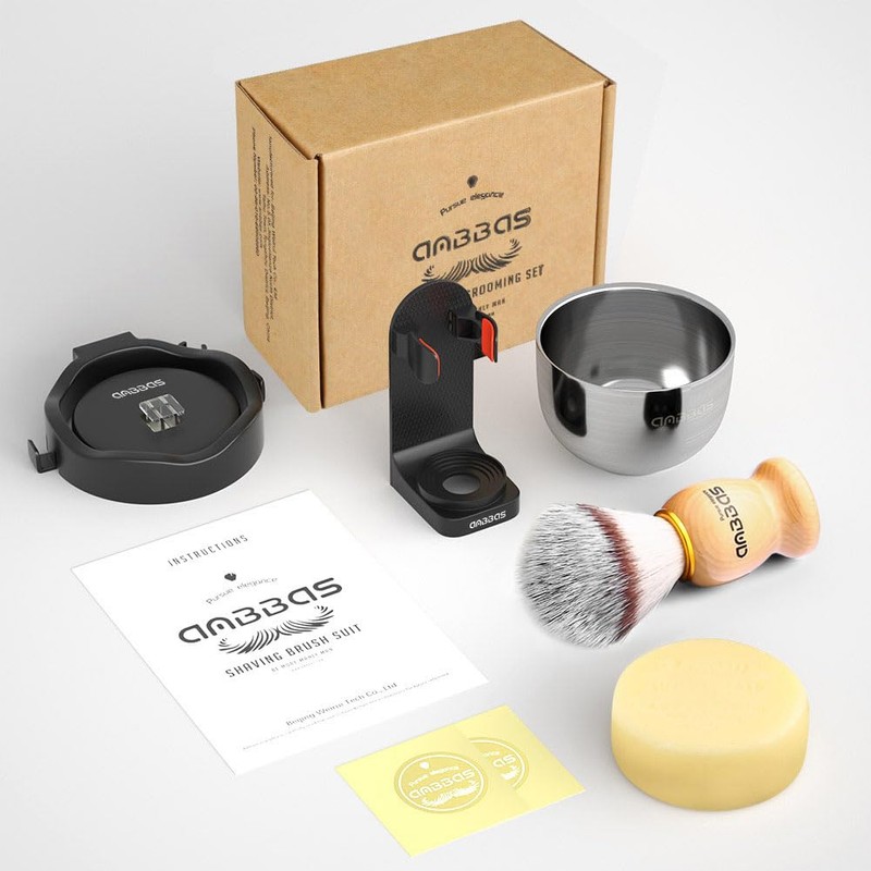 Anbbas 5IN1 Shaving Brush Set,Nylon Bristles Wood Handle and Stainless Steel Soap Bowl,ABS Wall Mounted Shaving Holders for Brush and Bowl with 3.5 oz Shaving Soap Refill