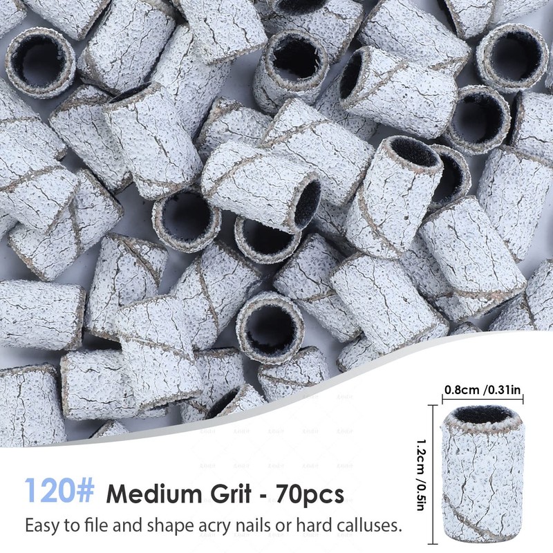 - Total 210 pieces nail grit and 1 mandrel: 1 x 70 pieces coarse grit 80# brown; 1 x 70 pieces medium grit 120# white; 1 x 180 pieces fine grain 240# ---black; 1 mandrel, suitable for most size 3/32 inch shaft nail drills, comes with a cute and dust tight tight compact box.