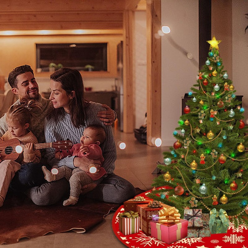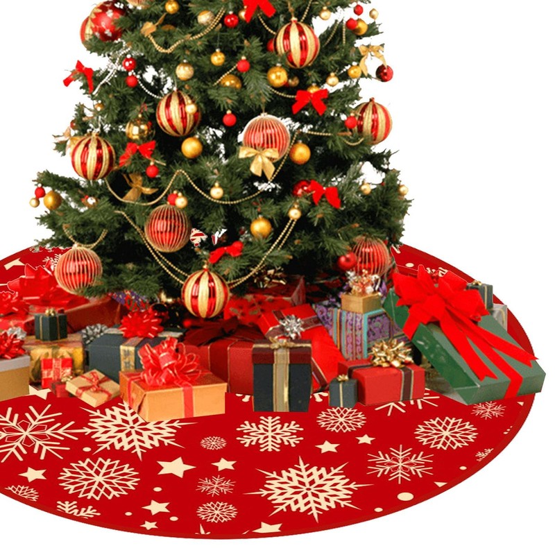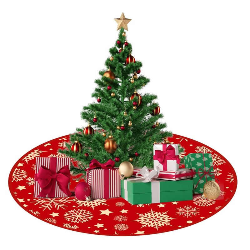 - Atmospheric Design The warm red of our Christmas tree rug with vibrant green and snowflake and star patterns creates a natural Christmas atmosphere. Make your Christmas tree more eye-catching and let everyone fever for Christmas.